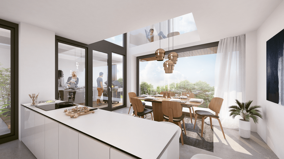 Architecture at its best. Leben am Stadtrand. Chillen im Grünen. So könnte eine Kurzbeschreibung der vier Luxus-Doppelhaushälften lauten, die einen wunderschönen Ausblick Richtung Sophienalpe bieten. Die einzelnen Einheiten verfügen im Untergeschoß über eine Doppelgarage, den Eingangsbereich, einen Hobbyraum, den Technikraum und einen außenliegenden Aufgang in den großen Garten. Im Erdgeschoß beginnt der Raum von vorne mit dem Essraum und der Küche, die Nebenräume befinden sich mit dem Treppenhaus in der Mitte und endet in Richtung Garten mit einem großzügigen Wohnraum. Im Obergeschoss haben wahlweise zwei oder drei Zimmer mit einem Sanitärraum Platz und im Dachgeschoss gibt es ein weiteres Schlafzimmer und eine Möglichkeit für ein Büro.